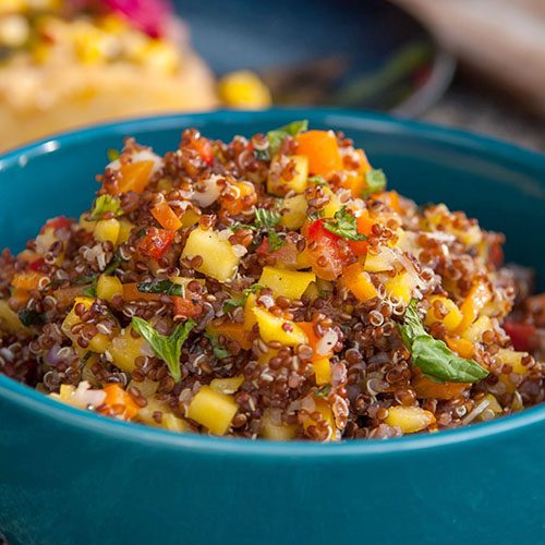 Ensalada de quinoa con zanahoria y mango INGREDIENTES: - 1 taza quinoa cruda - 2 zanahorias grandes - 1 cebolla morada - Jugo de limón (1/4 de taza) - 4 cucharadas de...