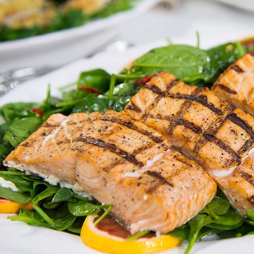Salmón a la parilla con ensalada de espinaca...